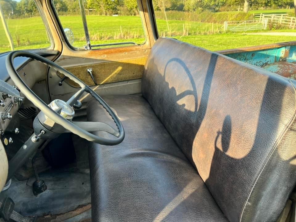 This deluxe model comes with additional stainless trim, a chrome grille, spare wheel holder and of course the coveted big back window! The truck also features an uncut original dashboard with an original radio, speaker, and antenna. The bench seat is also original and the longbed will take two Harley’s with the tailgate up!
